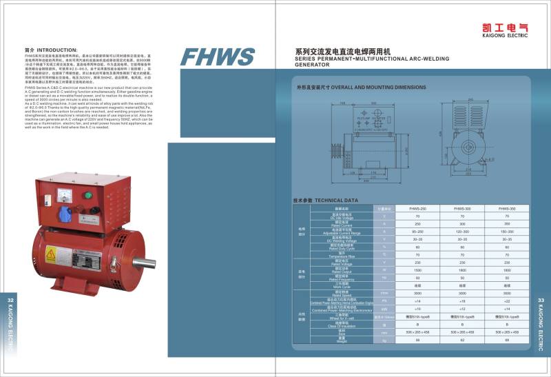 FHWS Series A. C&D. C electrical machine is our new product that can provide A.C generating and D.C welding function simultaneously. Either gasoline engine diesel can act as a movable/fixed power, and to realize its double-function a speed of 3000 circles per minute is also needed.