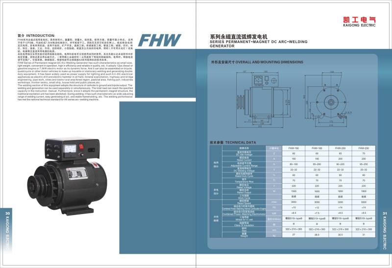 FHW Series of Permanent magnet DC Arc-Welding Generator has such characteristics as small size,light weight, convenient in operation, high in efficiency and reliable in quality, etc. It adopts 12ps diesel or gasoline engine or 7.5KW electric motor as its dynamic force. And it can also be assembled on tricycle. quadricycle or other motor vehicles to make up movable or stationary welding and generating double duty equipment. It has been widely used as power supply for lighting and such AC-DC electrical appliances as electric drill and electric hammer in oil field, mineral exploitation, highway and bridgeengineering, pipe work, cities and towns rural area forest region, pastoral area, fishing port, industries workshops ,frontier sentry, small ship, house hold and public places, etc.