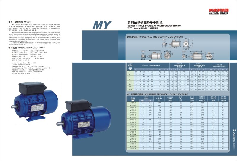 The MY series aluminum shell capacitor running motor adopts the latest international design and is developed from high-quality materials in accordance with the relevant standards of IEC. It has good performance, reliable and safe operation, beautiful appearance, convenient maintenance, low noise, micro vibration, light weight, A series of advantages such as simple structure. This series of motors can be used in household equipment, water pumps, fans and self-recording instruments.