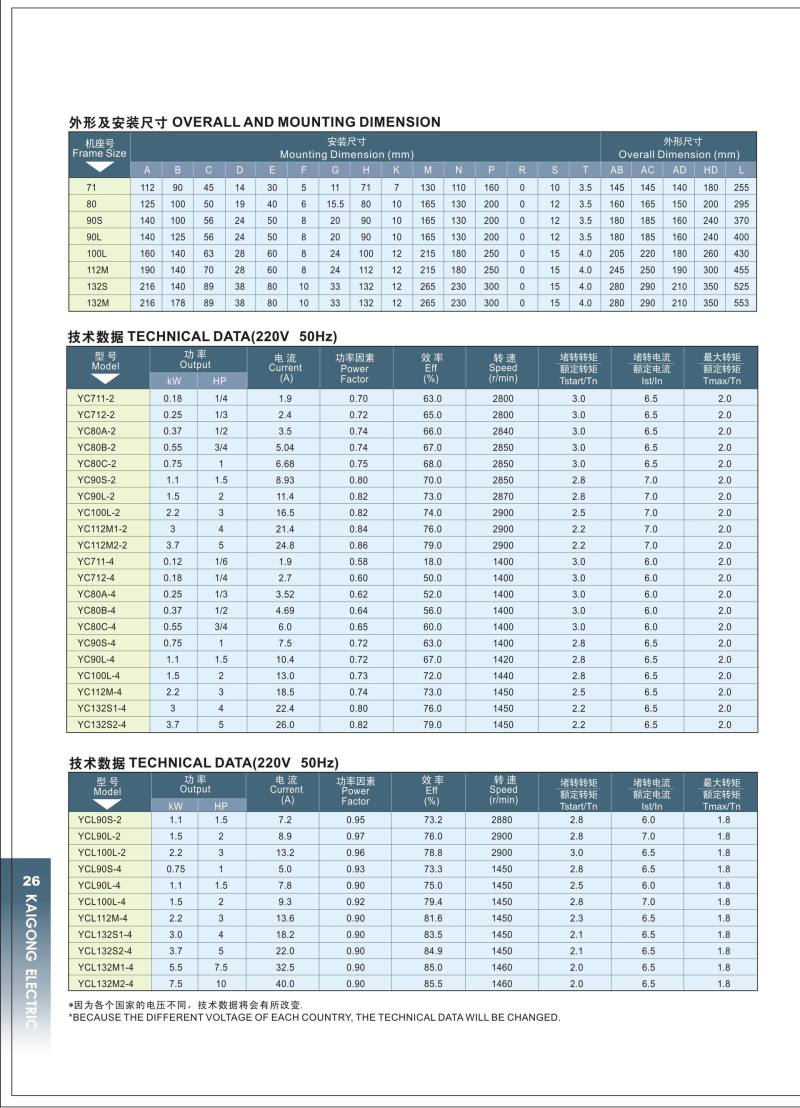 YC series motors are of IP44 totally enclosed fan-cooled (TEFC) type, capacitor starting for rated output up to 3HP, on rated voltage and 50Hz, the starting torque is three times more than the rated torque, while 60Hz is 2.75 times more. Capacitors start and run type for motors 4HP and above. It has following features: high starting torque, smooth running,