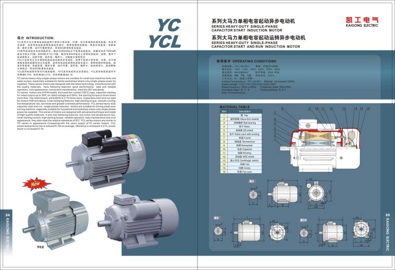 low temperature rise, low noise and greater overload performance. YCL series heavy-duty capacitor start and run, single phase induction motors are suitable for driving small-size turning machine, especially suitable for household and workshop where only single-phase power be supplied. This series of motors are designed with advanced technique and made of high quality materials. It also has following features: low noise, low temperature rise, small starting current, high starting torque, reliable operation, easy maintenance and nice appearance, they also meet the relative standards of IEC. YCL series motors are similar to YC series in appearance. Comparing with the same output ofYC series motors, YCL series temperature rise is reduced 8.74k on average, efficiency is increased 4.21%, power factor is increased 0.16.