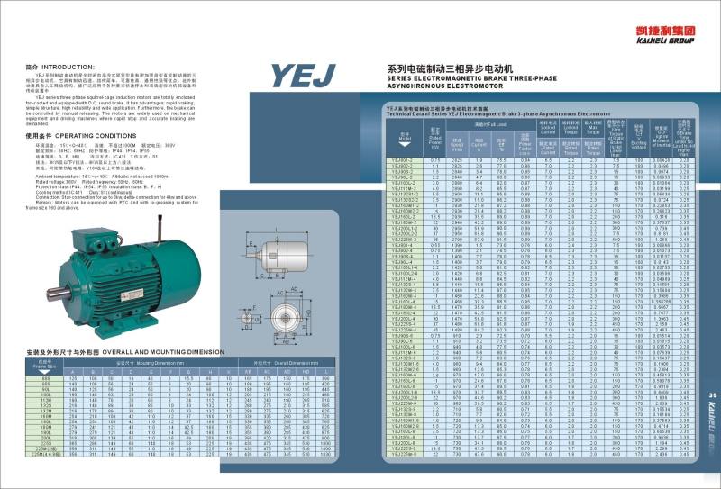 YEJ series three phase squirrel-cage induction motors are totally enclosed fan-cooled and equipped with D. C. round brake. It has advantages: rapid braking,simple structure, high reliability and wide application. Furthermore, the brake can be controlled by manual releasing. The motors are widely used on mechanical equipment and driving machines where rapid stop and accurate braking are demanded.
